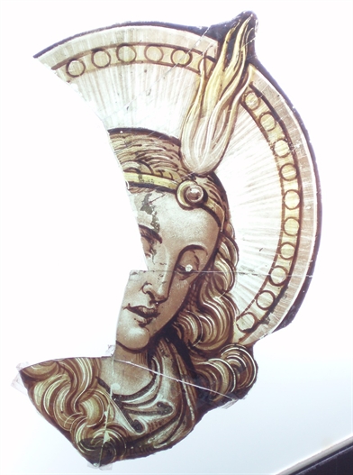 Une pièce de vitrail peint en cours de restauration
