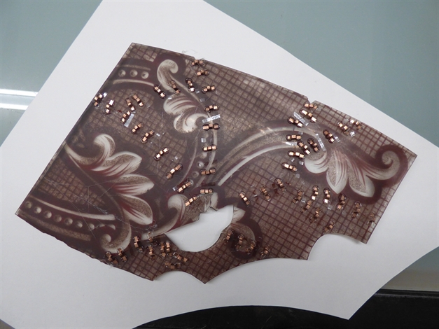 La méthode tiffany a été utilisée pour assembler la lacune repeinte et les parties d’origines restaurées par collages