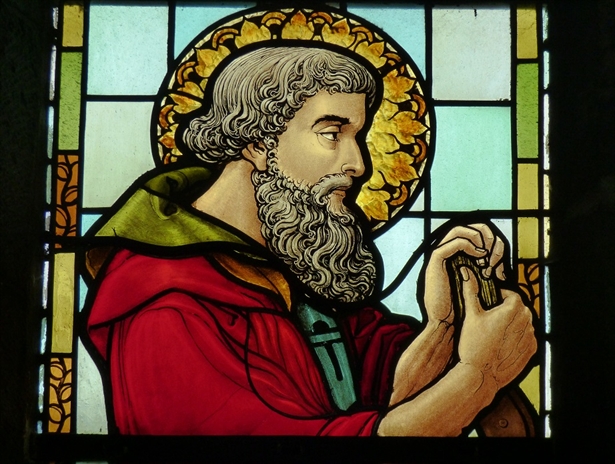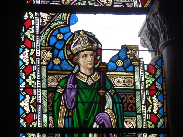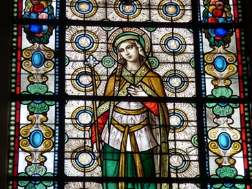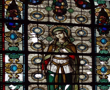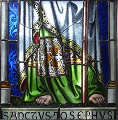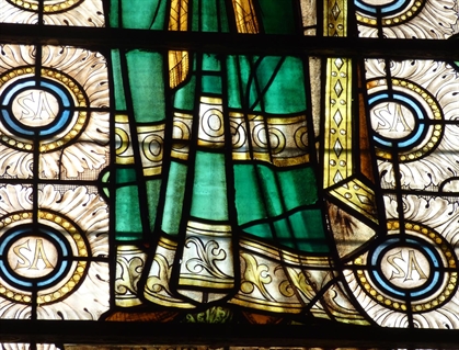 Lorsqu’une aussi grande partie d’un vitrail a disparu, il est indispensable de rechercher tous les débris de verre coloré et tous les bouts de plombs oxydés tombés au sol comme indices pour la reconstituer le plus fidèlement possible. Dans ce cas-ci, à part la crosse du saint, c’est presqu’une symétrie parfaite. Cela simplifie le travail.