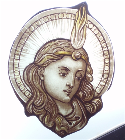 Reproduction d’un visage peint sur le verre. Le client a privilégié l’esthétique aux règles strictes de la restauration d’un vitrail. Il a souhaité que la pièce soit repeinte entièrement alors que pour faire les choses dans les règles de l’art, il aurait fallu procéder par collages et ne repeindre que la partie manquante.
